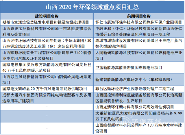 通過(guò)山西省政府辦公廳印發(fā)的《關(guān)于印發(fā)2020年省級(jí)重點(diǎn)工程項(xiàng)目名單的通知》可知,山西省級(jí)重點(diǎn)工程共248項(xiàng),其中建設(shè)項(xiàng)目170項(xiàng),前期項(xiàng)目78項(xiàng),涉及環(huán)保領(lǐng)域的項(xiàng)目有哪些呢?經(jīng)過(guò)整理發(fā)現(xiàn)如下: