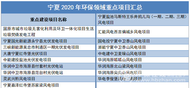 2020年,寧夏重點(diǎn)建設(shè)項(xiàng)目共有80項(xiàng),重點(diǎn)預(yù)備項(xiàng)目共計(jì)27項(xiàng),重點(diǎn)前期項(xiàng)目共計(jì)37項(xiàng),總投資達(dá)5126.4億元。其中生態(tài)環(huán)保領(lǐng)域主要涉及污水處理廠、生活垃圾焚燒發(fā)電等環(huán)保項(xiàng)目,具體見下表: