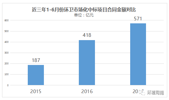 2015年之前,環(huán)衛(wèi)市場化進(jìn)程相對比較平靜。進(jìn)入2016年,環(huán)衛(wèi)市場化呈現(xiàn)出跳躍式增長態(tài)勢,合同金額同比(與2015年相對)增幅高達(dá)223%。2017年我國的環(huán)衛(wèi)市場化延續(xù)了2016年的強(qiáng)勁走勢,截止1-6月份合同金額接近600億元,全年將輕松跳過1000億元關(guān)口。