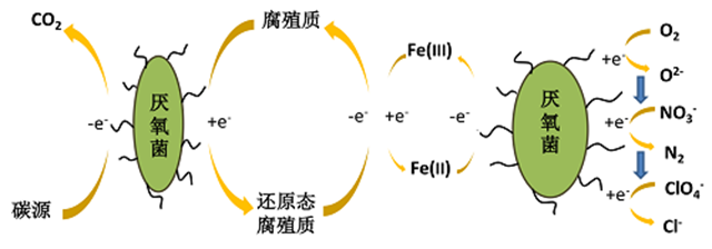 利用醌類(lèi)物質(zhì)及其聯(lián)合氧化鐵的電子穿梭作用和腐殖質(zhì)中醌類(lèi)結(jié)構(gòu)大量存在的特點(diǎn),通過(guò)在厭氧生物體系中加入腐殖質(zhì)或者同時(shí)加入腐殖質(zhì)和氧化鐵,促進(jìn)體系中的電子傳遞效率,達(dá)到顯著提升高氯酸鹽/硝酸鹽還原效率的效果。