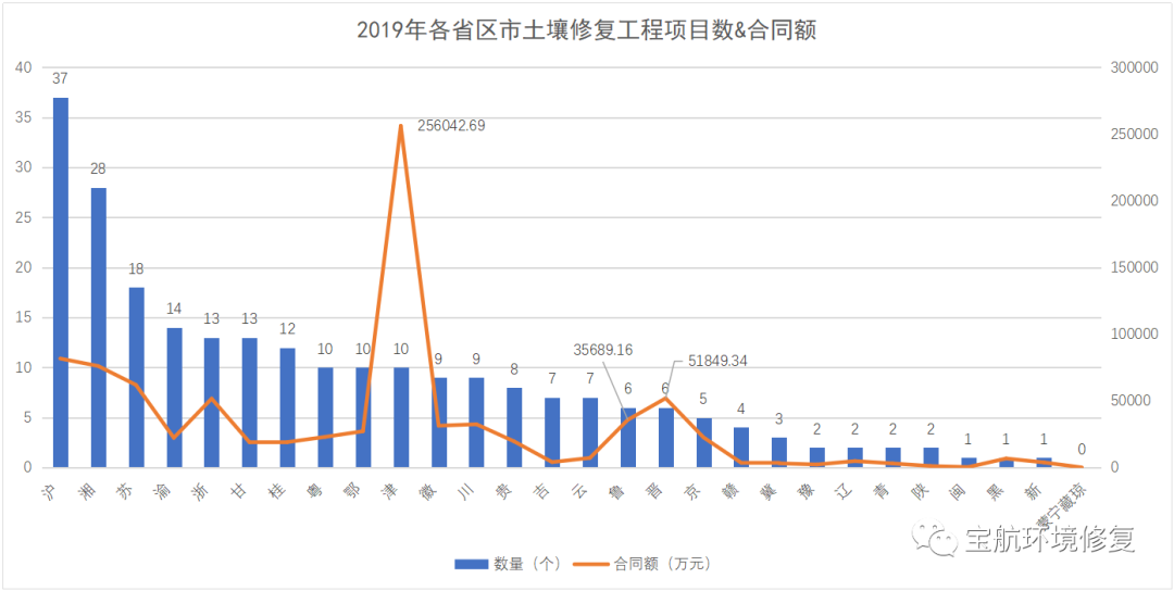 圖2 各省區(qū)市土壤修復(fù)工程項(xiàng)目數(shù)&合同額