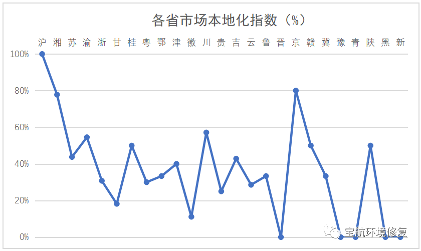 除了污染特征、地方財(cái)力等因素外,市場環(huán)境也是我們關(guān)注的重點(diǎn),為此我們提出了一個(gè)簡單的“市場本地化指數(shù)”,即省外企業(yè)中標(biāo)項(xiàng)目數(shù)量在該省份全部項(xiàng)目中所占的比例。