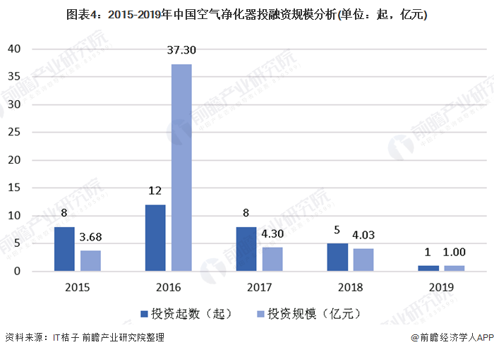 根據(jù)IT桔子數(shù)據(jù)統(tǒng)計(jì),2015-2019年,我國(guó)空氣凈化器的投資金額呈現(xiàn)波動(dòng)變化態(tài)勢(shì),2016年行業(yè)投融資數(shù)量和規(guī)模達(dá)到近年來(lái)峰值,2017年開(kāi)始行業(yè)投融資規(guī)模和數(shù)量大幅縮減,2018年行業(yè)投資5起,規(guī)模為4.03億元,2019年行業(yè)的投資起數(shù)降為1起,規(guī)模為1億元。