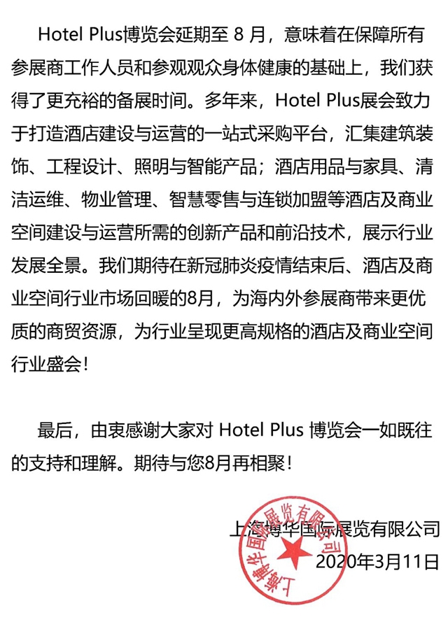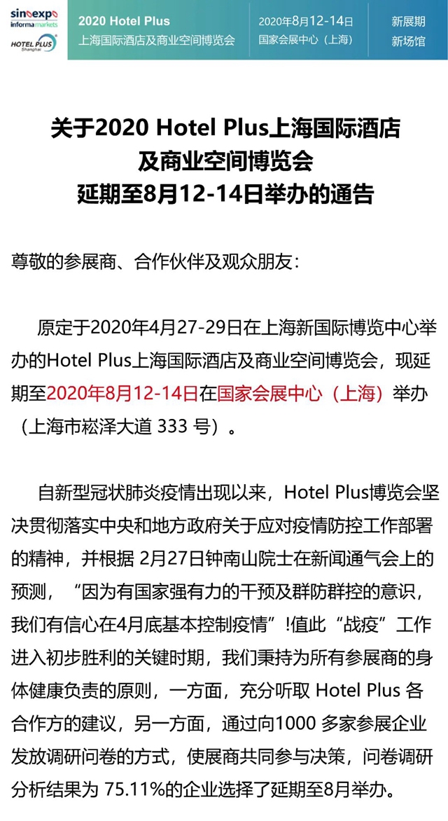 受新型冠狀病毒影響,全國(guó)各行各業(yè)的經(jīng)濟(jì)活動(dòng)都受到了不同程度的影響。作為國(guó)內(nèi)知名展會(huì),Hotel Plus時(shí)刻關(guān)注著酒店及商業(yè)空間的行業(yè)發(fā)展。秉持著為所有參展商及觀眾的身體健康負(fù)責(zé)的原則,經(jīng)主辦方慎重考慮,Hotel Plus上海國(guó)際酒店及商業(yè)空間博覽會(huì)及旗下子展決定延期至8月。