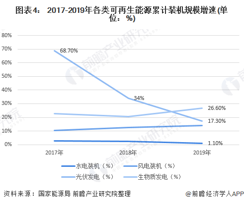各類可再生能源累計裝機增速方面,2019年生物質(zhì)發(fā)電累計裝機規(guī)模增速達到26.60%,明顯高于其他可再生能源。我國光伏發(fā)電累計裝機規(guī)模增速變化較大,由2017年的68.70%下降至17.30%,下降了約4倍,主要原因在于2018年,我國光伏產(chǎn)業(yè)進入轉(zhuǎn)型調(diào)整期。受政策轉(zhuǎn)向、產(chǎn)業(yè)轉(zhuǎn)型等因素綜合影響,光伏發(fā)電收益前景受挫,光伏累計裝機量增速雖有下降但整體呈增長趨勢。除了光伏發(fā)電累計裝機規(guī)模增速變化較大之外,其他如水電、風(fēng)電、生物質(zhì)等增發(fā)展較為穩(wěn)定。水電累計裝機規(guī)模平均增速達2.1%,風(fēng)電裝機達12.30%,生物質(zhì)增速達23.30%。