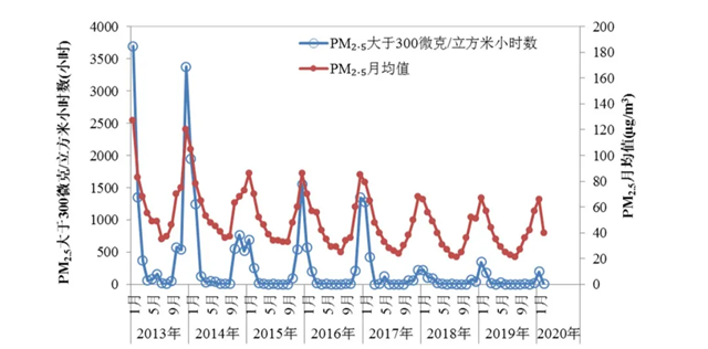 第一批實(shí)施環(huán)境空氣質(zhì)量新標(biāo)準(zhǔn)的74個(gè)城市自2013年開始開展PM2.5監(jiān)測,從2013年1月至2020年2月逐月PM2.5 月均值和PM2.5小時(shí)濃度超過300微克/立方米的小時(shí)數(shù)來看,每年P(guān)M2.5發(fā)生極重污染的時(shí)段主要集中在秋冬季,以每年11月至1月期間出現(xiàn)頻次最高。且PM2.5月均濃度與當(dāng)月小時(shí)極重污染的發(fā)生頻次間有較好的對應(yīng)關(guān)系,能夠?qū)χ匚廴咎鞖獍l(fā)生情況有較好的反映。2019年,74城市共發(fā)生599次PM2.5小時(shí)濃度超過300微克/立方米的情況,與2013年相比下降了94.2%,2020年1—2月,74城市共發(fā)生199次PM2.5小時(shí)濃度超過300微克/立方米的情況,比2013年同期減少96.1%,再次說明經(jīng)過實(shí)施強(qiáng)有力的大氣污染防治措施,重污染天氣顯著下降。