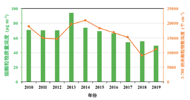 有關(guān)研究表明,高濃度PM2.5 污染發(fā)生前,往往伴隨著納米級超細(xì)顆粒物的累積現(xiàn)象,這些超細(xì)粒子的質(zhì)量濃度雖然不高,但在適宜氣象條件推動和各種氣態(tài)污染物(SO2、NOx、VOCs)存在的條件下,能夠快速凝結(jié)成核和長大,質(zhì)量濃度激增從而造成PM2.5重污染天氣發(fā)生。根據(jù)北京大學(xué)胡敏教授研究團(tuán)隊(duì)的研究成果,近十年來北京市空氣中3-700nm級別的超細(xì)顆粒物數(shù)濃度在2013年至2014年最高,自2015年開始顯著下降,與PM2.5的年均濃度變化趨勢有較好的一致性。這說明了當(dāng)前所采取的大氣污染防治措施既有效控制了PM2.5質(zhì)量濃度,同時(shí)也顯著降低了納米級超細(xì)粒子的數(shù)濃度,取得了顯著的大氣污染治理的成效,也使得天更藍(lán)了。