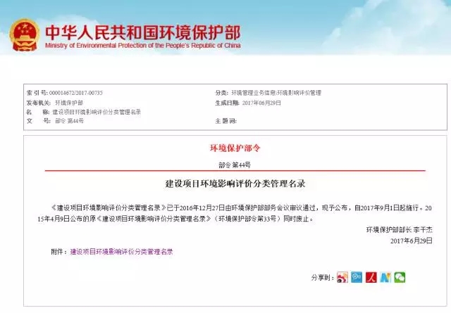 第八條 本名錄自2017年9月1日起施行。2015年4月9日公布的原《建設項目環(huán)境影響評價分類管理名錄》(環(huán)境保護部令第33號)同時廢止。
