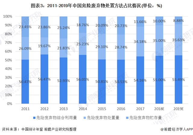 隨著環(huán)保行業(yè)的發(fā)展,我國危險廢棄物處置中綜合利用比重越來越高,由2011年的50.47%溫和上升到2017年的54.16%,前瞻初步估計2019年,危廢綜合利用占比將達到55.49%,深度資源化正成為危廢行業(yè)的發(fā)展方向;2015以來危廢貯存占比逐年下降,初步估計2019年危廢貯存量占比為8.88%;危廢處置占比也呈現(xiàn)增長態(tài)勢,初步估計2019年危廢處置方法占比達到35.63%。