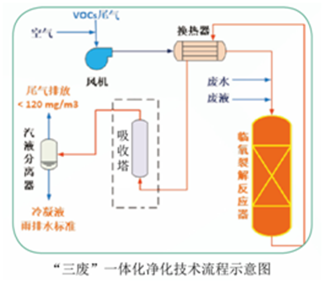 在臨氧裂解反應(yīng)器內(nèi),可以同時(shí)處理含有機(jī)污染物的廢氣、廢水和廢液,使氣、水達(dá)標(biāo)排放。