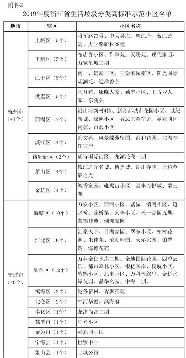 根據(jù)《關(guān)于印發(fā)〈浙江省城鎮(zhèn)生活垃圾分類實(shí)施方案〉的通知》(浙委辦發(fā)〔2017〕85號(hào))、《關(guān)于印發(fā)〈浙江省生活垃圾分類“五大”專項(xiàng)行動(dòng)計(jì)劃〉的通知》(浙分類〔2018〕4號(hào))、《關(guān)于高水平推進(jìn)生活垃圾治理工作的意見》(浙委辦〔2019〕59號(hào))等要求,各地對照《浙江省高標(biāo)準(zhǔn)生活垃圾分類示范小區(qū)評(píng)價(jià)標(biāo)準(zhǔn)(試行)》(建城發(fā)〔2017〕373號(hào)),組織開展了省級(jí)生活垃圾分類示范片區(qū)、高標(biāo)準(zhǔn)示范小區(qū)創(chuàng)建工作。經(jīng)各市驗(yàn)收、省分類辦審核,現(xiàn)將2019年度全省生活垃圾分類示范片區(qū)、高標(biāo)準(zhǔn)示范小區(qū)名單予以公布。