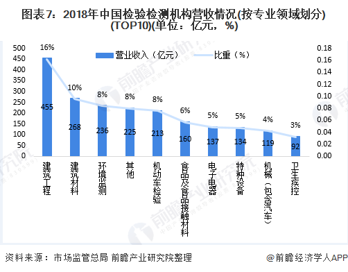 按細(xì)分領(lǐng)域來(lái)看,2018年,我國(guó)檢驗(yàn)檢測(cè)市場(chǎng)中營(yíng)收規(guī)模排名前三的細(xì)分領(lǐng)域?yàn)榻ㄖこ?、建筑材料和環(huán)境檢測(cè),分別實(shí)現(xiàn)營(yíng)業(yè)收入455億元、268億元和236億元;營(yíng)收占比分別為16%、10%和8%。