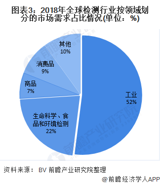 據(jù)BV集團(tuán)的統(tǒng)計(jì)數(shù)據(jù)顯示,2018年全球檢測(cè)市場(chǎng)的下游需求中,工業(yè)領(lǐng)域的占比最多,為52%,其次是生命科學(xué)、食品和環(huán)境檢測(cè)領(lǐng)域,需求占比約22%。具體來(lái)說(shuō),工業(yè)領(lǐng)域主要涉及石油、燃?xì)?、化工等行業(yè)的檢測(cè);而生命科學(xué)、食品和環(huán)境檢測(cè)領(lǐng)域主要涉及醫(yī)藥、農(nóng)產(chǎn)品、食品等行業(yè)??梢?jiàn)全球TIC行業(yè)的市場(chǎng)需求仍主要來(lái)源于傳統(tǒng)領(lǐng)域。