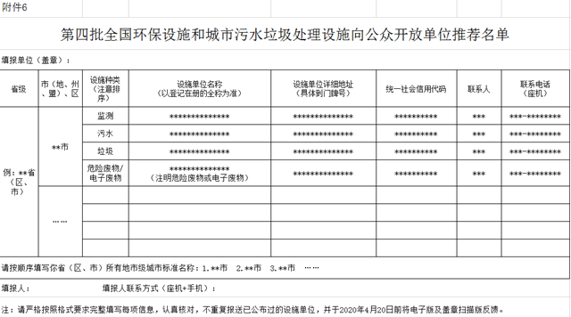 根據(jù)生態(tài)環(huán)境部《2020年環(huán)保設(shè)施和城市污水垃圾處理設(shè)施向公眾開(kāi)放工作實(shí)施方案》和各類《開(kāi)放工作指南》要求,請(qǐng)各地生態(tài)環(huán)境部門會(huì)同住建(排水、環(huán)衛(wèi))部門確定本地區(qū)第四批擬向公眾開(kāi)放設(shè)施單位名單;請(qǐng)省生態(tài)環(huán)境監(jiān)測(cè)中心梳理省駐市生態(tài)環(huán)境監(jiān)測(cè)中心開(kāi)放情況,確保省駐市生態(tài)環(huán)境監(jiān)測(cè)中心在本批次全部開(kāi)放。請(qǐng)各地生態(tài)環(huán)境部門和省生態(tài)環(huán)境監(jiān)測(cè)中心認(rèn)真填寫《第四批全國(guó)環(huán)保設(shè)施和城市污水垃圾處理設(shè)施向公眾開(kāi)放單位推薦名單》(附件6),并于4月20日前報(bào)送省廳。