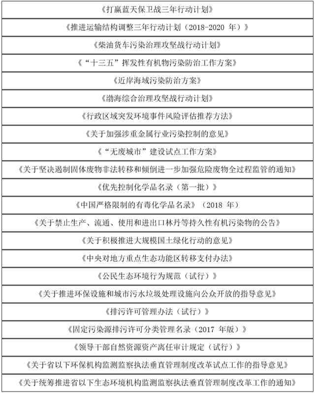 生態(tài)保護(hù)紅線、“三線一單”、去產(chǎn)能、區(qū)域聯(lián)防聯(lián)控(京津冀、汾渭平原、長三角)、綠色科技創(chuàng)新、國際合作、生態(tài)環(huán)境監(jiān)測能力提升、黑臭水體治理、農(nóng)村生態(tài)環(huán)境綜合治理、流域污染治理和流域生態(tài)補(bǔ)償、海洋生態(tài)治理和監(jiān)管、農(nóng)用地和重點區(qū)域用地、工業(yè)污染源、危廢處置、生態(tài)修復(fù)、公益訴訟、排污權(quán)&用能權(quán)交易、環(huán)保執(zhí)法和垂改等。