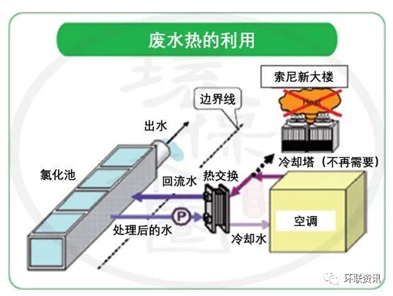 將從水再生中心獲得的處理后的廢水供應(yīng)到新的索尼公司大樓,以冷卻大樓的空調(diào)設(shè)備。空調(diào)產(chǎn)生的廢熱,通過熱交換器處理后被廢水吸收。