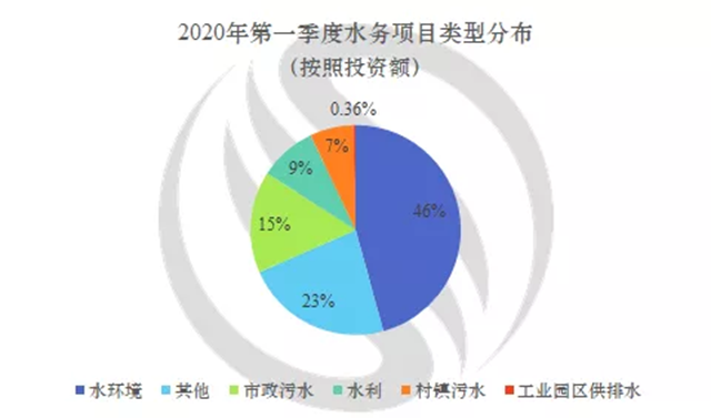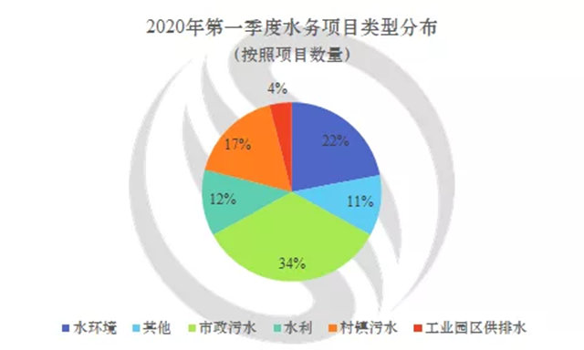 E20研究院數(shù)據(jù)中心從E標(biāo)通(信息來源:全國(guó)各級(jí)政府采購(gòu)網(wǎng)/公共資源交易平臺(tái))獲悉,2020年1-3月,社會(huì)資本共中標(biāo)近100個(gè)水務(wù)投資運(yùn)營(yíng)PPP項(xiàng)目,投資額近700億元。其中,包含約34個(gè)市政污水處理項(xiàng)目,22個(gè)水環(huán)境項(xiàng)目,17個(gè)村鎮(zhèn)污水項(xiàng)目, 12個(gè)水利項(xiàng)目......,從2020年水務(wù)市場(chǎng)中標(biāo)情況來看,市政污水項(xiàng)目數(shù)量最多,占比整個(gè)水務(wù)市場(chǎng)的34%。水環(huán)境項(xiàng)目投資額占比最大,占比整個(gè)水務(wù)市場(chǎng)的近一半。