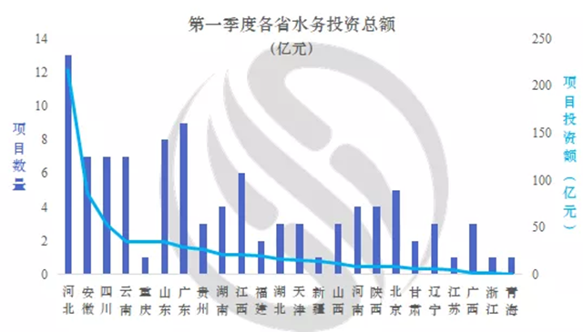 從全國(guó)范圍來看,第一季度全國(guó)有23個(gè)省市涉及水務(wù)投資運(yùn)營(yíng)項(xiàng)目。其中河北省投資額已超200億元,僅唐山市全域治水清水潤(rùn)城縣區(qū)工程PPP項(xiàng)目投資額就已達(dá)到118.08億元,是迄今為止唐山市實(shí)施的最大的PPP項(xiàng)目。安徽省投資額86億元,四川省投資額53億元,分列二、三位。