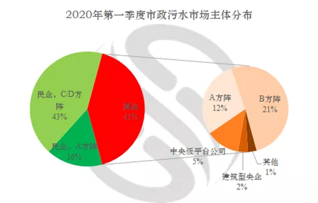 在市政污水市場(chǎng)民企所獲得的份額占比近六成,民企所占的份額中C/D方陣占比43%,A方陣占比16%。四成的項(xiàng)目被國(guó)企拿到,國(guó)企所占的份額中,B方陣占21%, A方陣占比12%,中央級(jí)平臺(tái)公司占比5%,建筑型央企占比2%。