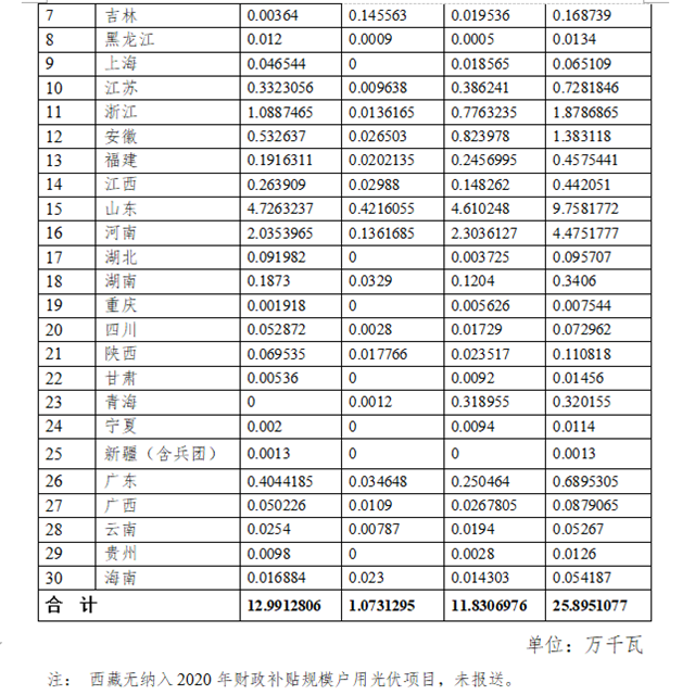 按照《國(guó)家能源局關(guān)于2020年風(fēng)電、光伏發(fā)電項(xiàng)目建設(shè)有關(guān)事項(xiàng)的通知》(國(guó)能發(fā)新能〔2020〕17號(hào))和《國(guó)家能源局綜合司關(guān)于2019年戶用光伏項(xiàng)目信息公布和報(bào)送有關(guān)事項(xiàng)的通知》(國(guó)能綜通新能〔2019〕45號(hào))關(guān)于戶用光伏項(xiàng)目管理有關(guān)要求,全國(guó)共有30個(gè)省份報(bào)送了戶用光伏項(xiàng)目信息(西藏?zé)o納入2020年財(cái)政補(bǔ)貼規(guī)模戶用光伏項(xiàng)目,未報(bào)送)。
