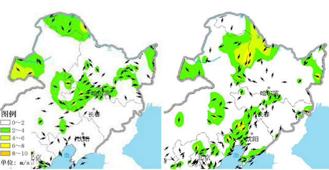 4月13日8時(左)和20時(右)東北地區(qū)風(fēng)場實(shí)況