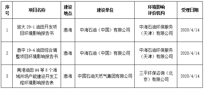 原標題:生態(tài)環(huán)境部關(guān)于2020年4月13日—2020年4月17日海洋工程建設(shè)項目環(huán)境影響評價文件受理情況的公示