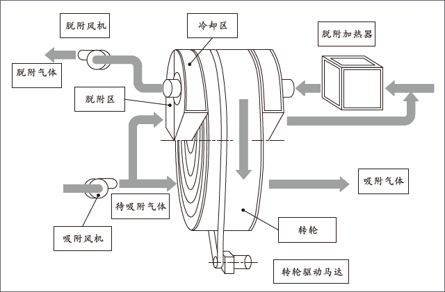 據(jù)介紹,分子篩吸附濃縮轉(zhuǎn)輪分為吸附區(qū)、脫附區(qū)、冷卻區(qū),轉(zhuǎn)輪在各個區(qū)域連續(xù)運轉(zhuǎn)。VOCs廢氣經(jīng)過濾裝置等預(yù)處理之后,進入轉(zhuǎn)輪吸附區(qū)被吸附凈化排除;吸附飽和后的分子篩進入脫附區(qū),經(jīng)高溫熱風進行脫附濃縮;高溫脫附后的區(qū)域由冷空氣進行冷卻再生,用于冷卻的空氣經(jīng)加熱后可以作為再生空氣使用。
