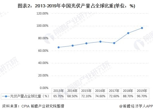 我國(guó)是光伏產(chǎn)業(yè)大國(guó),擁有全球最完整的產(chǎn)業(yè)鏈。2019年,同期,盡管在政策調(diào)整下,我國(guó)光伏應(yīng)用市場(chǎng)有所下滑,但受益于海外市場(chǎng)的增長(zhǎng),中國(guó)光伏各環(huán)節(jié)產(chǎn)業(yè)規(guī)模依舊保持了快速增長(zhǎng)勢(shì)頭。2019年,中國(guó)光伏組件產(chǎn)量達(dá)到了98.6GW,占全球產(chǎn)量比重不斷上升。作為全球最大光伏產(chǎn)品制造國(guó)及出口國(guó),中國(guó)光伏裝機(jī)量、發(fā)電量已連續(xù)多年位列全球首位。