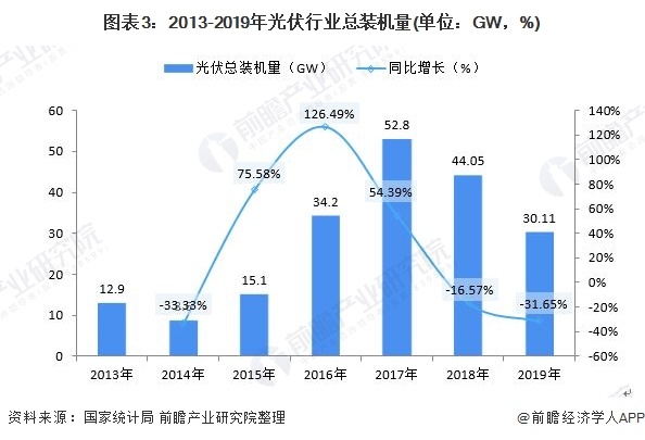 2013-2019年,光伏行業(yè)總裝機(jī)量呈現(xiàn)出波動(dòng)變化的趨勢(shì)。2013-2017年,呈現(xiàn)出波動(dòng)上升的趨勢(shì),2017年,我國(guó)光伏行業(yè)裝機(jī)總量為52.8GW,為歷年最高值,2018-2019年,受政策影響,光伏行業(yè)裝機(jī)量驟減,2019年光伏行業(yè)裝機(jī)總量為30.11GW,較上年下降31.65%。
