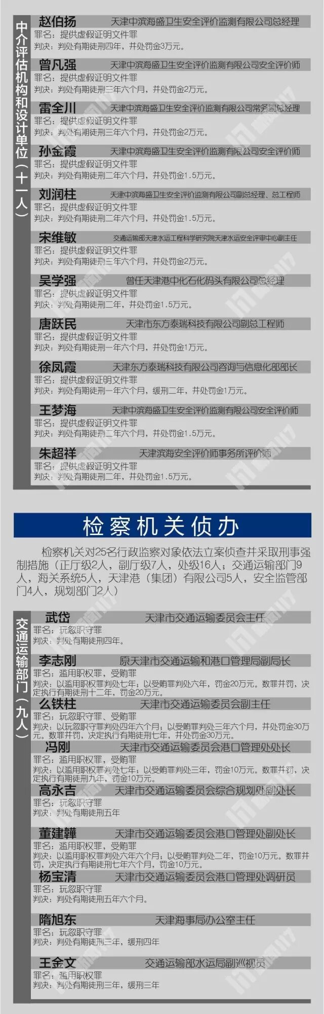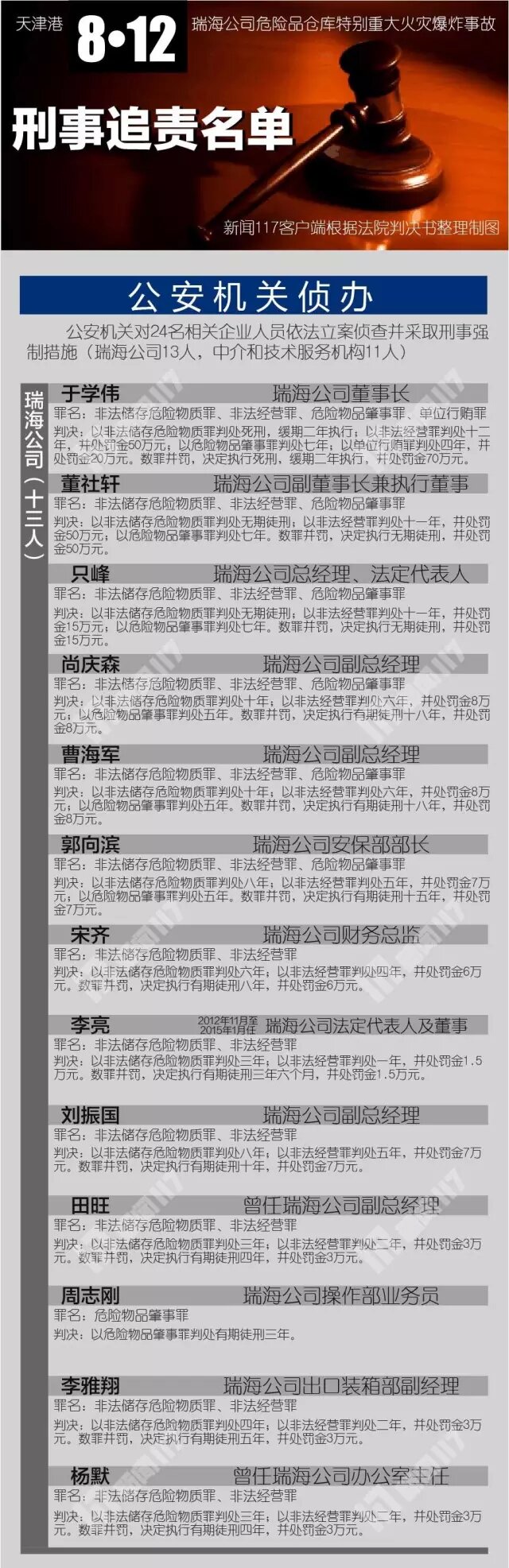 根據(jù)各被告人犯罪的事實、性質(zhì)、情節(jié)和造成的社會危害后果以及在共同犯罪中的地位、作用,法院依法作出一審判決。瑞海公司董事長于學(xué)偉構(gòu)成非法儲存危險物質(zhì)罪、非法經(jīng)營罪、危險物品肇事罪、行賄罪,予以數(shù)罪并罰,依法判處死刑緩期二年執(zhí)行,并處罰金人民幣70萬元;瑞海公司副董事長董社軒、總經(jīng)理只峰等5人構(gòu)成非法儲存危險物質(zhì)罪、非法經(jīng)營罪、危險物品肇事罪,分別被判處無期徒刑到十五年有期徒刑不等的刑罰;瑞海公司其他7名直接責(zé)任人員分別被判處十年到三年有期徒刑不等的刑罰。中濱安評公司犯提供虛假證明文件罪,依法判處罰金25萬元:中濱安評公司董事長、總經(jīng)理趙伯揚(yáng)等11名直接責(zé)任人員分別被判處四年到一年六個月不等的有期徒刑。天津市交通運(yùn)輸委員會主任武岱等25名國家機(jī)關(guān)工作人員分別被以玩忽職守罪或濫用職權(quán)罪判處三年到七年不等的有期徒刑,其中李志剛等8人同時犯受賄罪,予以數(shù)罪并罰。