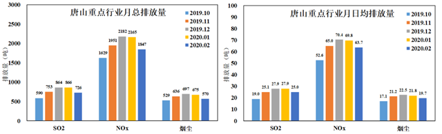 通過分析唐山市電力、鋼鐵、焦化、水泥、平板玻璃五大行業(yè)在線監(jiān)測數(shù)據(jù)發(fā)現(xiàn),秋季(2019.10.1)以來唐山市重點行業(yè)污染排放除在個別管控時段有所下降外,其余時間基本穩(wěn)中有漲。但春節(jié)疫情防控(2020.1.24)開始后,污染物排放量仍有高值出現(xiàn),且總體較前幾個月僅略有下降。因此,占比較高的重污染行業(yè)污染排放變化不大,仍是疫情防控期間PM2.5濃度未出現(xiàn)明顯降低的主觀因素。