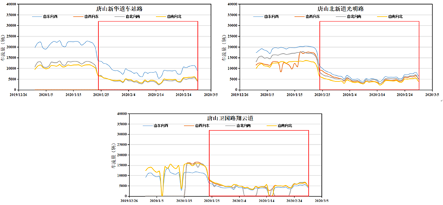 根據(jù)唐山市城區(qū)5條主干道車流量統(tǒng)計數(shù)據(jù)顯示,疫情期間車流量均明顯減小,日均車流量與非疫情期間比例在0.32~0.42之間,機動車排放明顯下降,由此可解釋疫情防控期間城市NO2的明顯降低。