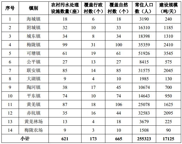 2)農(nóng)村部分:海城鎮(zhèn)、附城鎮(zhèn)、城東鎮(zhèn)、梅隴鎮(zhèn)、可塘鎮(zhèn)、公平鎮(zhèn)、聯(lián)安鎮(zhèn)、大湖鎮(zhèn)、陶河鎮(zhèn)、平東鎮(zhèn)、黃羌鎮(zhèn)、赤坑鎮(zhèn)、黃羌林場、梅隴農(nóng)場農(nóng)村部分合計新建621座農(nóng)村污水處理設(shè)施,擬建設(shè)總規(guī)模17125噸/天,服務(wù)農(nóng)村總常住人口約25.53萬人。