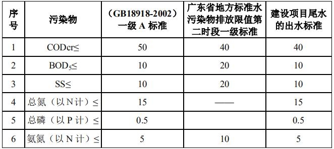 1)新建、擴建城鎮(zhèn)污水處理設(shè)施的出水水質(zhì)符合《城鎮(zhèn)污水處理廠污染物排放標準》(GB18918-2002)一級A標準和廣東省地方標準《水污染物排放限值》(DB44/26-2001)第二時段一級標準中的較嚴值;