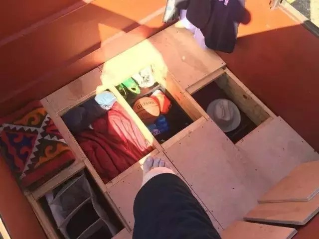 于是,為了將垃圾箱打造得更宜居,Jeff先在里邊鋪了一塊假地板,把地板下面放上許多個(gè)小格子,作為儲(chǔ)物的地方,