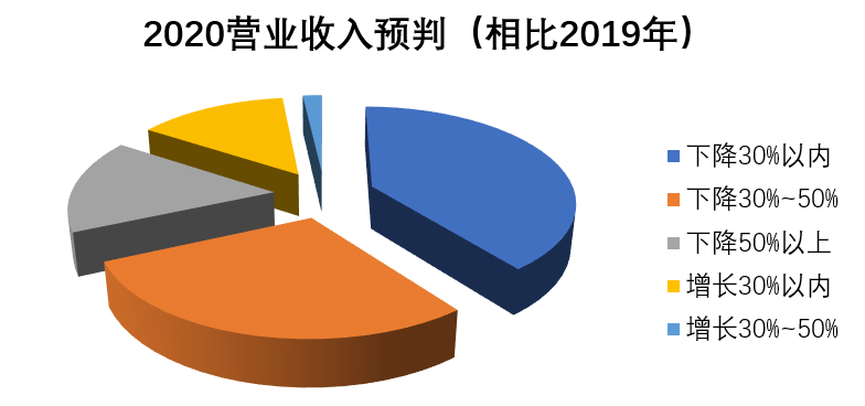 從調(diào)查結(jié)果得知,多數(shù)企業(yè)認(rèn)為今年的營收情況將受到一定程度的沖擊。有39.5%的企業(yè)認(rèn)為相比2019年,企業(yè)2020年的營業(yè)收入將下降30%以內(nèi);認(rèn)為將下降30%——50%的企業(yè)占比28.9%;另有15.8%的企業(yè)認(rèn)為收入將下降超過50%??上驳氖?,在目前嚴(yán)峻的形勢下,仍有部分企業(yè)對未來的營收情況持樂觀態(tài)度:有14%的企業(yè)認(rèn)為2020年的收入將比2019年增長30%以內(nèi);更有1.8%的企業(yè)認(rèn)為將增長30%~50%。