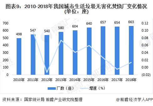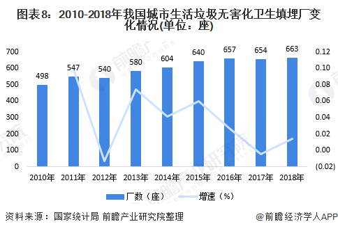 從無害化處理企業(yè)來看,2010-2018年,我國城市生活垃圾無害化衛(wèi)生填埋和焚燒廠數(shù)呈逐年增加趨勢。2018年,我國城市生活垃圾無害化衛(wèi)生填埋廠共663座,同比增加9座;無害化城市生活垃圾焚燒場數(shù)量為331座,同比增加45座。