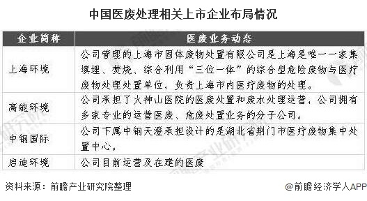 目前我國醫(yī)廢領(lǐng)域布局的企業(yè)較少,暫未形成激烈競爭的局面,相關(guān)的上市公司有上海環(huán)境、高能環(huán)境、中鋼國際、啟迪環(huán)境等。以下是4家與疫情期間醫(yī)廢處理相關(guān)的上市公司的布局情況:
