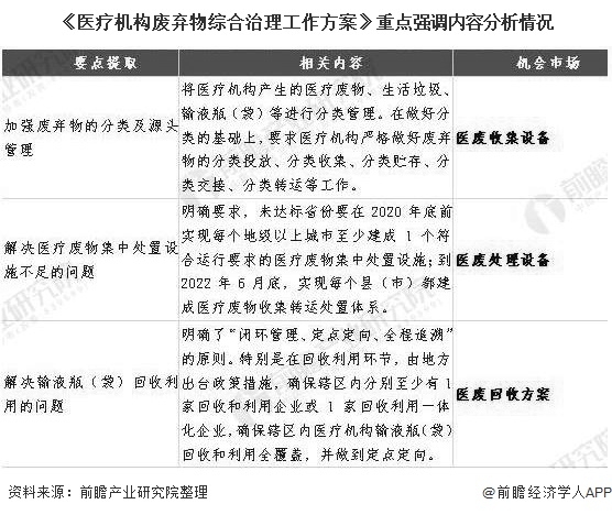 通過對該文件核心要點的解讀,可以看出未來與醫(yī)廢處理相關(guān)的醫(yī)廢處理設(shè)施、醫(yī)廢收集工具、醫(yī)廢回收利用方案等領(lǐng)域存在較大市場機會。