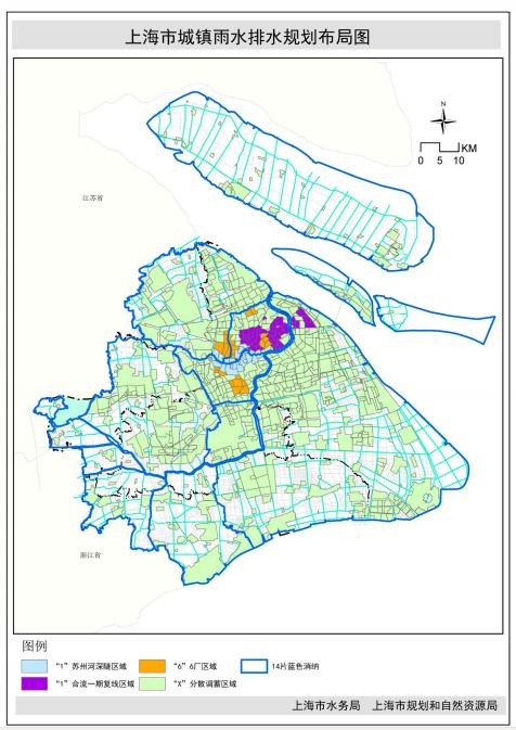 本市城鎮(zhèn)雨水排水規(guī)劃形成“1+1+6+X綠灰交融,14片藍色消納”的總體布局。即:規(guī)劃“1”蘇州河深隧區(qū)、“1”合流一期復(fù)線區(qū)、“6”六座污水廠周邊區(qū)域、“X”分散調(diào)蓄區(qū)等綠灰交融的四大服務(wù)區(qū)域;同時按照14個水利片的總體布局,推進河湖水系及除澇泵閘建設(shè),形成消納能力與城鎮(zhèn)雨水排水相匹配的防洪除澇體系。