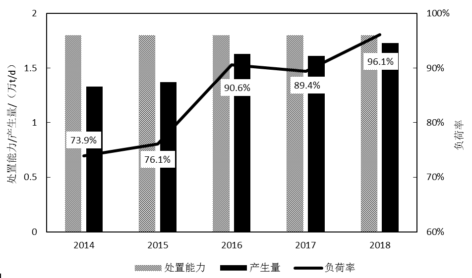武漢市醫(yī)療廢物產(chǎn)生量逐年增長(圖2),由2014年1.33萬 t/a增長至2018年1.73萬 t/a。武漢市現(xiàn)有醫(yī)療廢物處置中心的處置能力為1.8萬 t/a,負荷率由2014年73.9%增長至2018年96.1%,接近滿負荷運轉。2018年武漢市醫(yī)療廢物處置能力差值僅700 t/d。新冠疫情爆發(fā)后,武漢市設置定點醫(yī)院并新建、征用多處方艙醫(yī)院收容救治病人。自2020年1月31日以來,定點醫(yī)院持續(xù)增加,由1月31日6641張床位增加至2月22日22681張床位。根據(jù)武漢市衛(wèi)生健康委員會防控動態(tài),截至2月22日,武漢市已經(jīng)開艙的有13家方艙醫(yī)院,可以提供救治的床位達到13348張。計劃繼續(xù)新建方艙醫(yī)院,預計到2月25日武漢市儲備的方艙醫(yī)院床位將達到3萬張。截止2020年2月22日,武漢市新冠肺炎開放床位總計約36029 張,按醫(yī)療垃圾的生產(chǎn)率平均1.0 kg/(d·床)計算,則新冠肺炎醫(yī)療垃圾產(chǎn)生量約36 t/d。武漢市新增治愈出院病例于2020年2月20日首次大于新增確證病例,且治愈率持續(xù)上升,出現(xiàn)明顯“床等人”現(xiàn)象。武漢市未來開放床位數(shù)將持續(xù)增長,增長幅度基本不大,按最高總床位數(shù)5.5萬張估算(定點醫(yī)院2.5萬張,方艙醫(yī)院3萬張),新冠肺炎醫(yī)療垃圾最高產(chǎn)生量約55 t/d。武漢市按照1∶1的原則,配備后備處置能力,在現(xiàn)有全市處置能力50 t/d的基礎上,新建及啟用后備醫(yī)療廢物處置設施共計56.9 t/d,處置能力后續(xù)將持續(xù)增加。根據(jù)醫(yī)廢產(chǎn)生量與處置能力對比分析,新冠疫情爆發(fā)后,武漢市通過采取區(qū)域協(xié)同處理、啟用調(diào)配后備處置設施等措施,處置能力基本能實現(xiàn)醫(yī)療廢物“日產(chǎn)日清”。