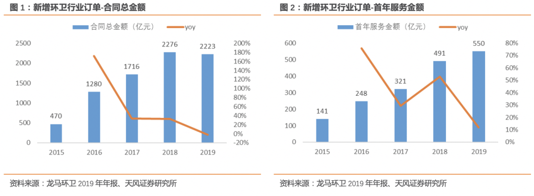 經(jīng)過2015年至今的快速推廣,全國環(huán)衛(wèi)行業(yè)新增年化訂單已經(jīng)達(dá)到550億,同比增長12%;總合同額達(dá)到2223億元,同比略降2%;平均合同期限4年,同比下降0.6年。2018-2019年連續(xù)兩年環(huán)衛(wèi)市場化新增合同總金額突破2000億元,市場化快速推廣。