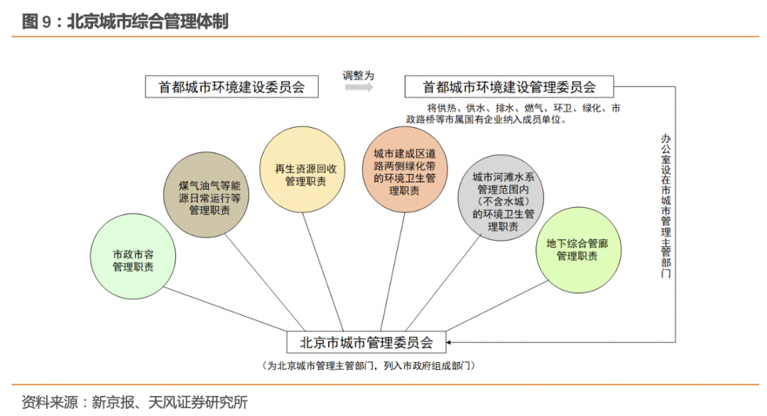 • 北京已成立城市管理委員會,整合市政市容委全部職責(zé)的基礎(chǔ)上,將多個市級部門與城市運(yùn)行管理相關(guān)的職責(zé)一并劃歸,比如發(fā)改委的煤、電、油、氣管理,市商務(wù)委的再生資源回收管理,市園林綠化局的城市綠化帶環(huán)境衛(wèi)生管理,市水務(wù)局的城市河湖周邊環(huán)境衛(wèi)生管理等。同時,財(cái)政預(yù)算維穩(wěn)資金和市政設(shè)施建設(shè)的統(tǒng)籌管理職責(zé),也將劃歸給城市管理委員會。