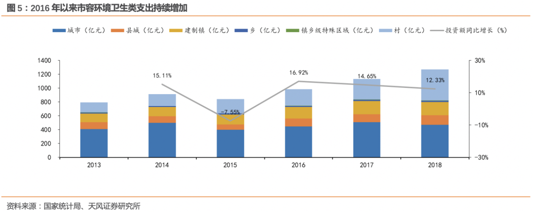 短期來看,環(huán)衛(wèi)行業(yè)的資金來源仍為財(cái)政資金城市環(huán)境衛(wèi)生支出。根據(jù)住建部統(tǒng)計(jì)年鑒,2018年我國城市、縣城、鎮(zhèn)、鄉(xiāng)、村等合計(jì)環(huán)境衛(wèi)生投資額1267億元,同比增長12.33%。2016以來市容環(huán)境衛(wèi)生類投資支出持續(xù)增加。