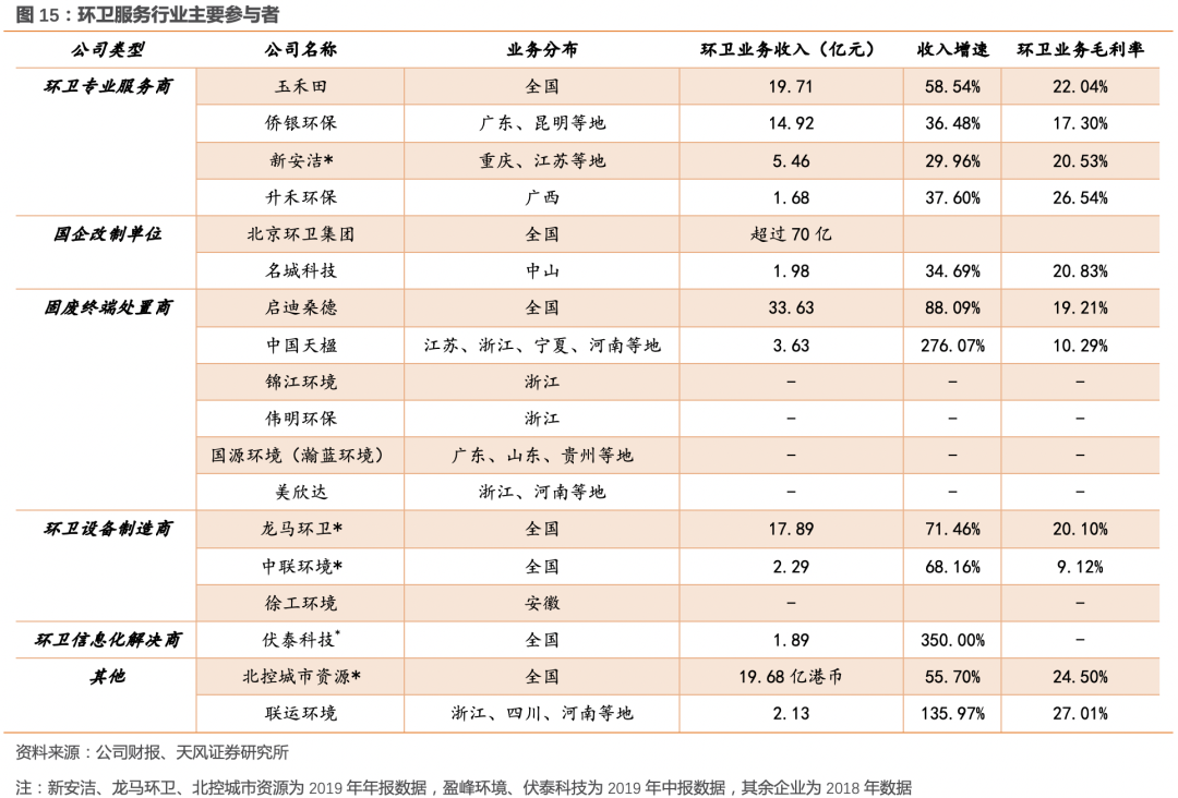 環(huán)衛(wèi)行業(yè)巨大的市場空間和良好的商業(yè)模式,吸引各方社會資本加入,2018年行業(yè)參與者約4000余家,前五大企業(yè)市場份額約11.4%。目前行業(yè)內(nèi)參與者可大致分為以下幾類:環(huán)衛(wèi)專業(yè)服務(wù)商如玉禾田、僑銀環(huán)保、新安潔、升禾環(huán)保等;國企改制單位,如北京環(huán)衛(wèi)集團(tuán)、名城科技等;固廢終端處置商,如啟迪桑德、中國天楹、錦江環(huán)境等;環(huán)衛(wèi)設(shè)備制造商,如龍馬環(huán)衛(wèi)、中聯(lián)環(huán)境;環(huán)衛(wèi)信息化解決商,如伏泰科技;以及其他新進(jìn)入者,如北控城市資源、聯(lián)運(yùn)環(huán)境等。