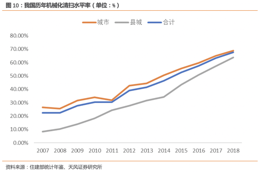 根據(jù) 2018 年《中國城鄉(xiāng)建設(shè)統(tǒng)計(jì)年鑒》計(jì)算,2018 年我國城市道路清掃面積 86.93億平方米,機(jī)械化清掃面積 59.86億平方米,機(jī)械化清掃率為 68.85%;縣城道路清掃保潔面積 25.56億平方米,機(jī)械化清掃面積16.80億平方米,機(jī)械化清掃率僅為 63.70%。