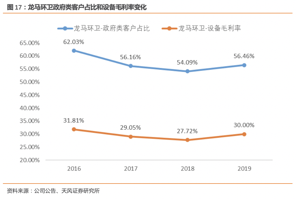 隨著環(huán)衛(wèi)市場化改革的推進(jìn),環(huán)衛(wèi)設(shè)備采購客戶類型發(fā)生顯著變化,從政府部門向市場化經(jīng)營主體轉(zhuǎn)變,需求從中高端產(chǎn)品走向高性價(jià)比的經(jīng)濟(jì)型產(chǎn)品。以龍馬環(huán)衛(wèi)為例,公司2016-2018年政府類客戶收入占比分別為62.03%、56.16%、54.09%,占比逐年下降,相應(yīng)毛利率有所下降。