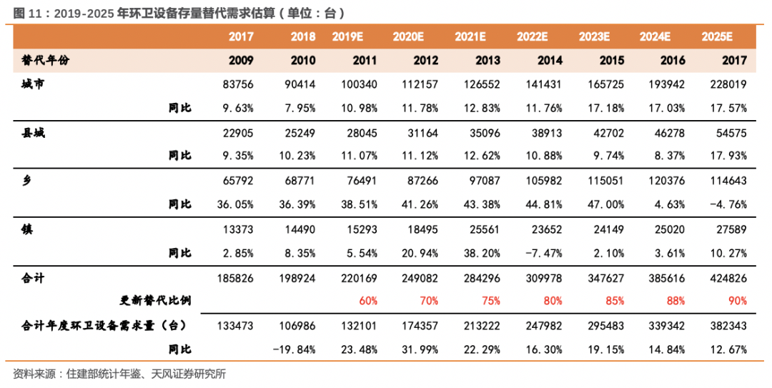 測算得到2019-2025年年度環(huán)衛(wèi)設(shè)備存量替代需求逐年增長,到2025年,年度環(huán)衛(wèi)設(shè)備存量替代需求將達(dá)到38萬臺。