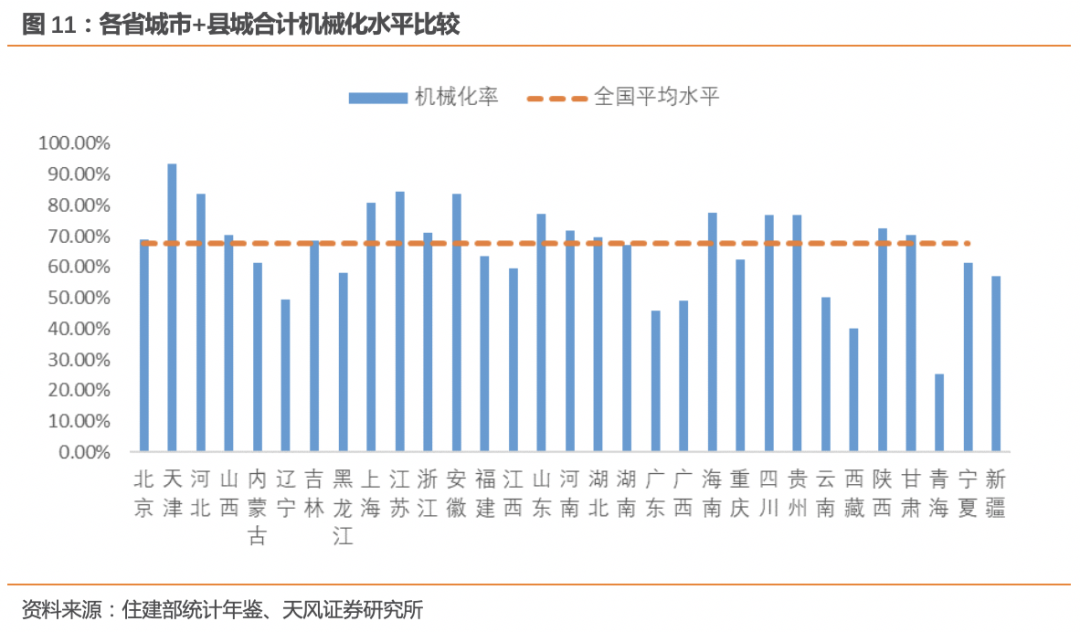 根據(jù)住建部的統(tǒng)計(jì)年鑒,2018年我國城市道路機(jī)械化率68.85%、縣城道路機(jī)械化率63.70%,城市和縣城合計(jì)的道路清掃保潔機(jī)械化率約67.68%,達(dá)到基本環(huán)衛(wèi)裝備階段。因經(jīng)濟(jì)發(fā)展水平與地域差異,不同區(qū)域間的機(jī)械化清掃水平存在差異,除省會城市和經(jīng)濟(jì)較發(fā)達(dá)地級市外,其他城市和縣城距離實(shí)現(xiàn)全面環(huán)衛(wèi)裝備階段還有差距。