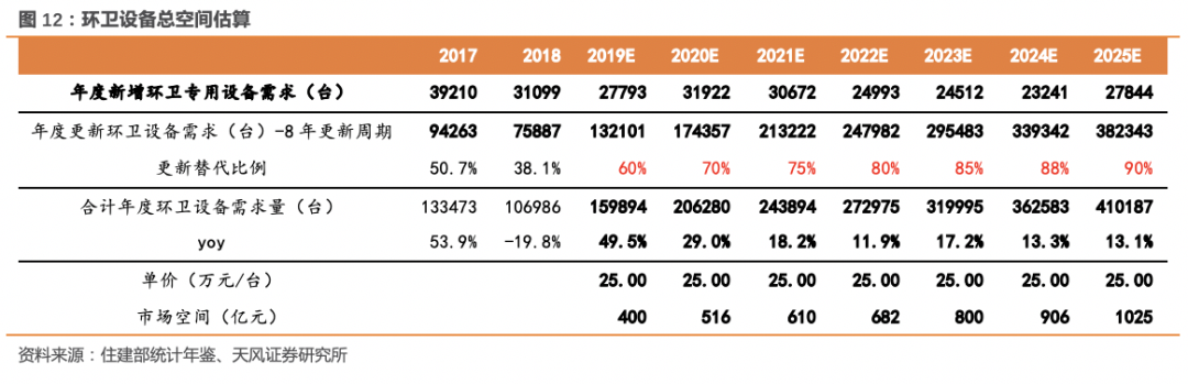 由于環(huán)衛(wèi)設(shè)備折舊年限5-10年,我們按照折舊期限8年進(jìn)行估算,考慮到設(shè)備技術(shù)更迭帶來的效率提升,更新后的設(shè)備作業(yè)效率更高,設(shè)備替代存在一定比例折扣,我們假設(shè)2019年更新設(shè)備的替代比例為60%(替代2011年環(huán)衛(wèi)設(shè)備),2020年更新設(shè)備的替代比例為70%(替代2012年環(huán)衛(wèi)設(shè)備),以此類推假設(shè)2021-2025年的替代比例分別為75%、80%、85%、88%、90%。